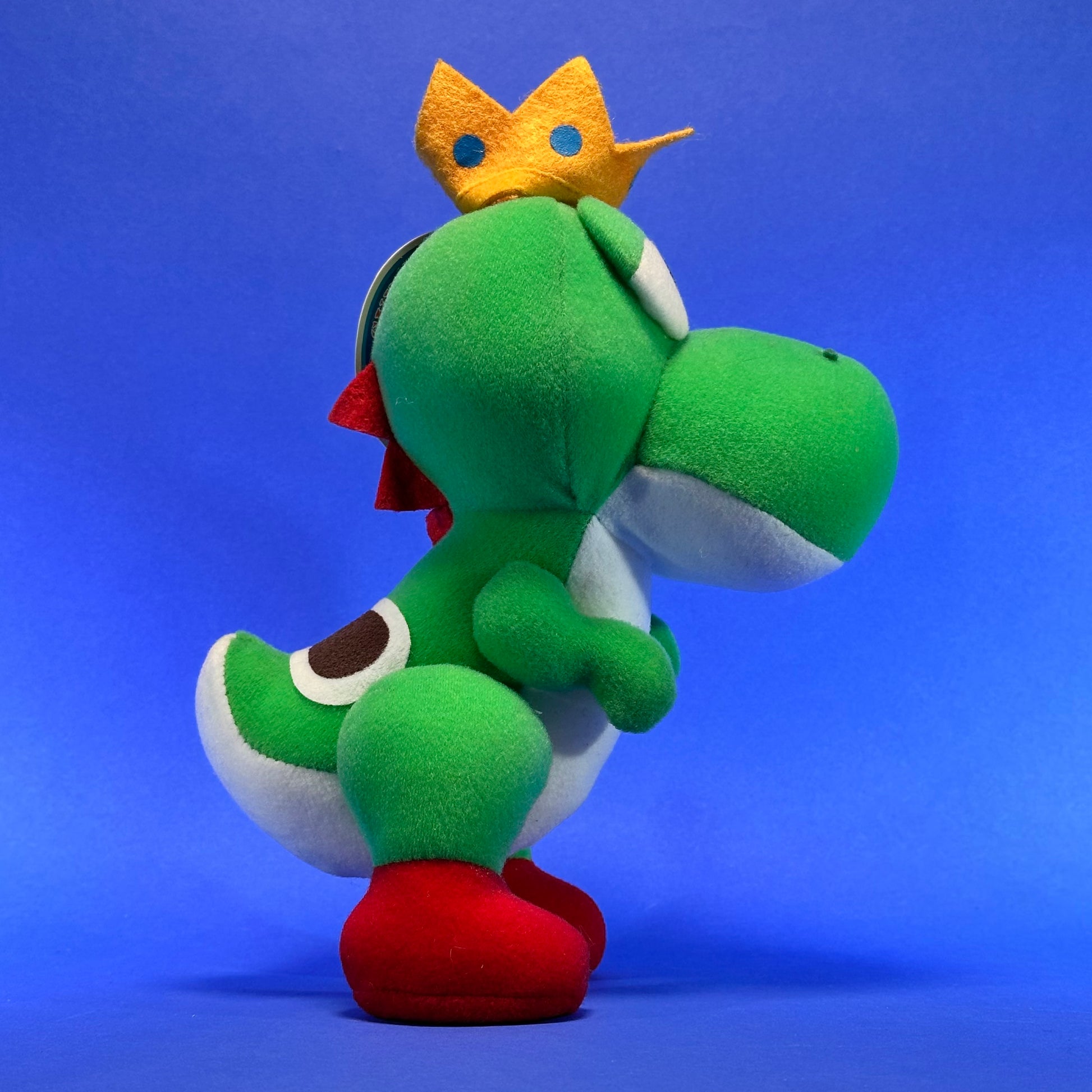 The King Yoshi plush was released in 1993 by Banpresto, it was made as a part of Super Mario All Stars for the SNES, in Super Mario Bros. 3, remake. One of the worlds, Ludwig von Koopa with a magic, of the king was transformed and appeared to look, the dinosaurs, of the King of Pipe Land, like a Yoshi with a crown on it's head, thus earning the name "King Yoshi".