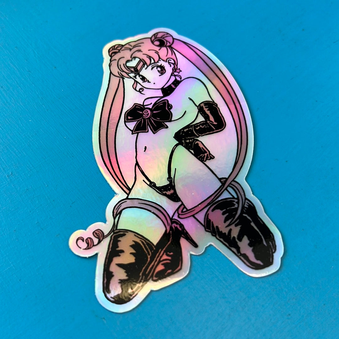 This holographic vinyl sticker is 4x2”.