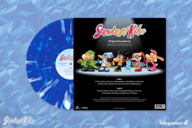 Includes 17 tracks by the Snowboard Kids Sound Team—Tomohiko Sato (Racjin Co., Ltd.) and Isao Kasai (Racjin Co., Ltd.)—on Channel 3 exclusive transparent blue with splatter vinyl, wrapped up in the original art from Snowboard Kids.