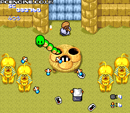 Star Parodier is a whimsical vertical-scrolling "cute 'em up" that spoofs Hudson Soft's serious Star Soldier series by sending three unconventional heroes—the Paro Caesar ship, a giant flying Bomberman, and an anthropomorphic PC Engine console—to save the planet Paroson. Tasked with stopping the villainous Mother Brain and her surreal army of mummies, snowmen, and giant fish, players blast through eight vibrant stages ranging from airborne amusement parks to toy factories. The game maintains the fast-paced, high-quality shooting mechanics of its parent series while replacing gritty sci-fi with lighthearted visual gags, such as defeated enemies waving white flags in surrender.