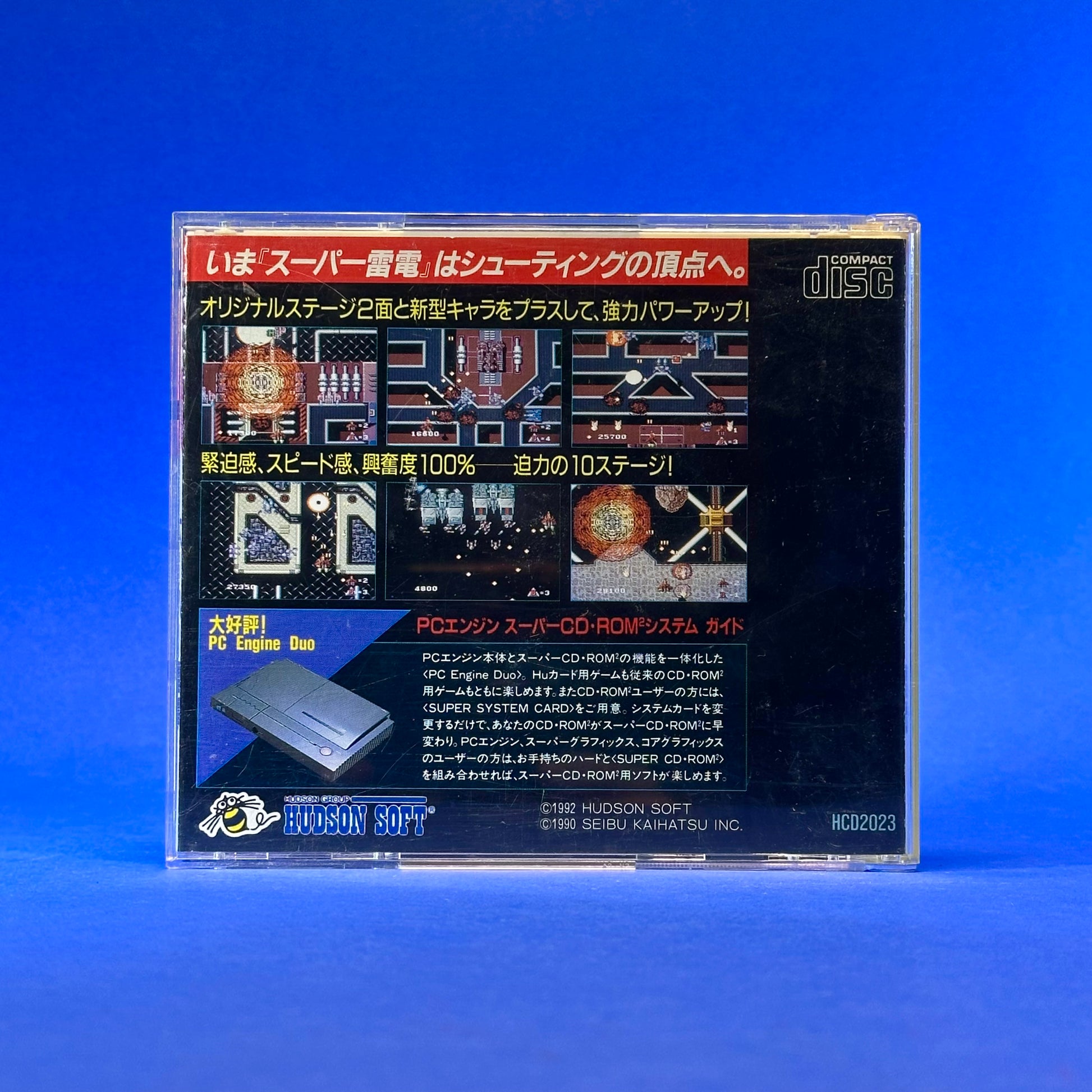Released on April 2, 1992, Super Raiden for the PC Engine Super CD-ROM² is an enhanced conversion of the 1990 arcade vertical-scrolling shooter. Set in the year 2090 during an alien invasion of Earth, players pilot the "Raiden Supersonic Attack Fighter" through ten vertically scrolling levels—expanding upon the eight stages found in the original arcade and HuCard versions with two exclusive CD-only levels. The game follows classic genre conventions where players cycle between the wide-range Vulcan Cannon (red) and the powerful Ion Laser (blue), supported by thermonuclear bombs and secondary missile systems. While maintaining the arcade's signature high difficulty, this version is specifically lauded for its vastly improved Redbook CD audio, featuring high-quality arranged music and enhanced sound effects.