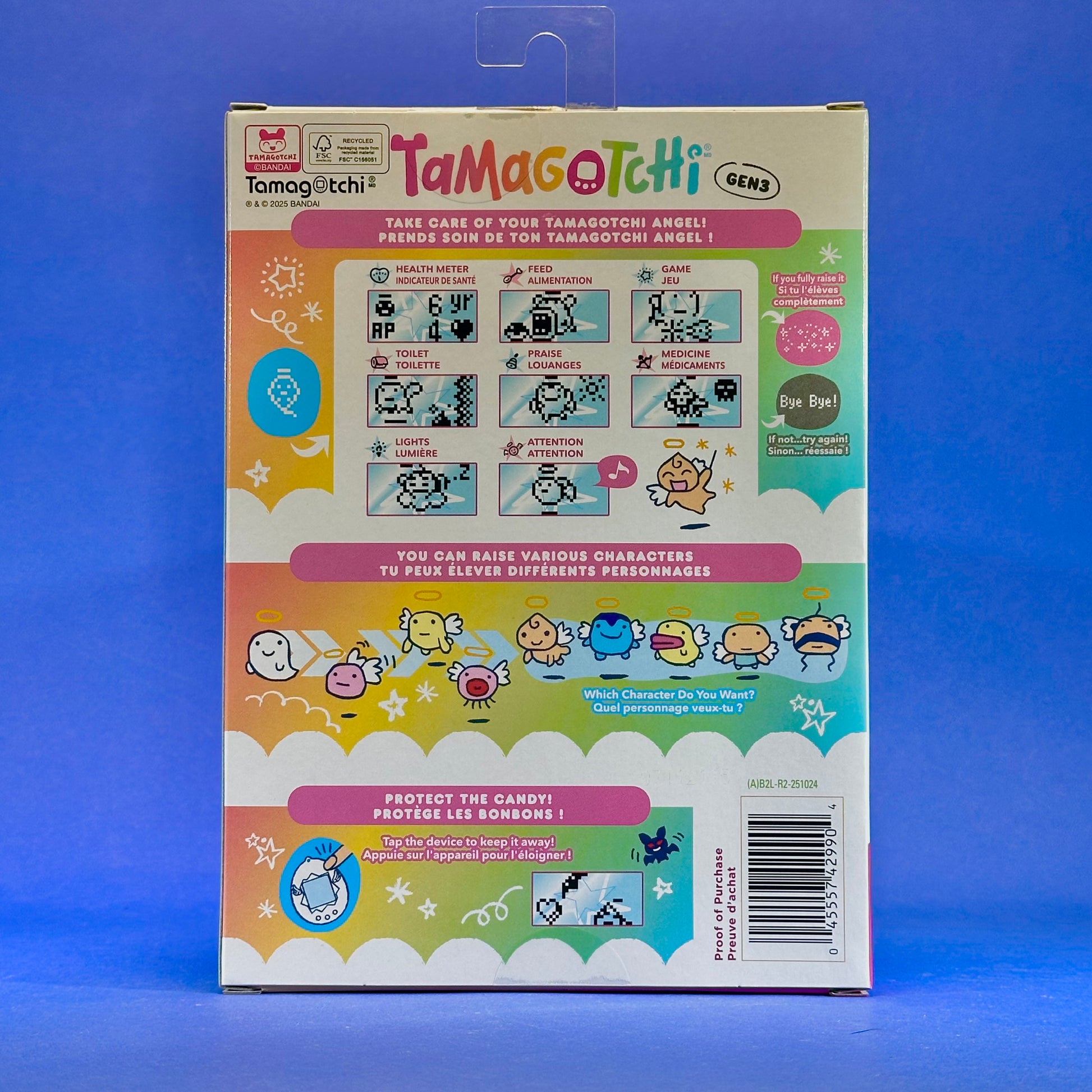Not only will you be able to feed your Tamagotchi characters, clean its poop, and heal its illnesses, but you can also do much more, including play the Shooting Star mini-game! Plus, enjoy Gen 3 care methods, such as offering praise to your Tamagotchi Angel character that has come to pray, or a tapping feature on the device to scare away the bat called BATTCHI!