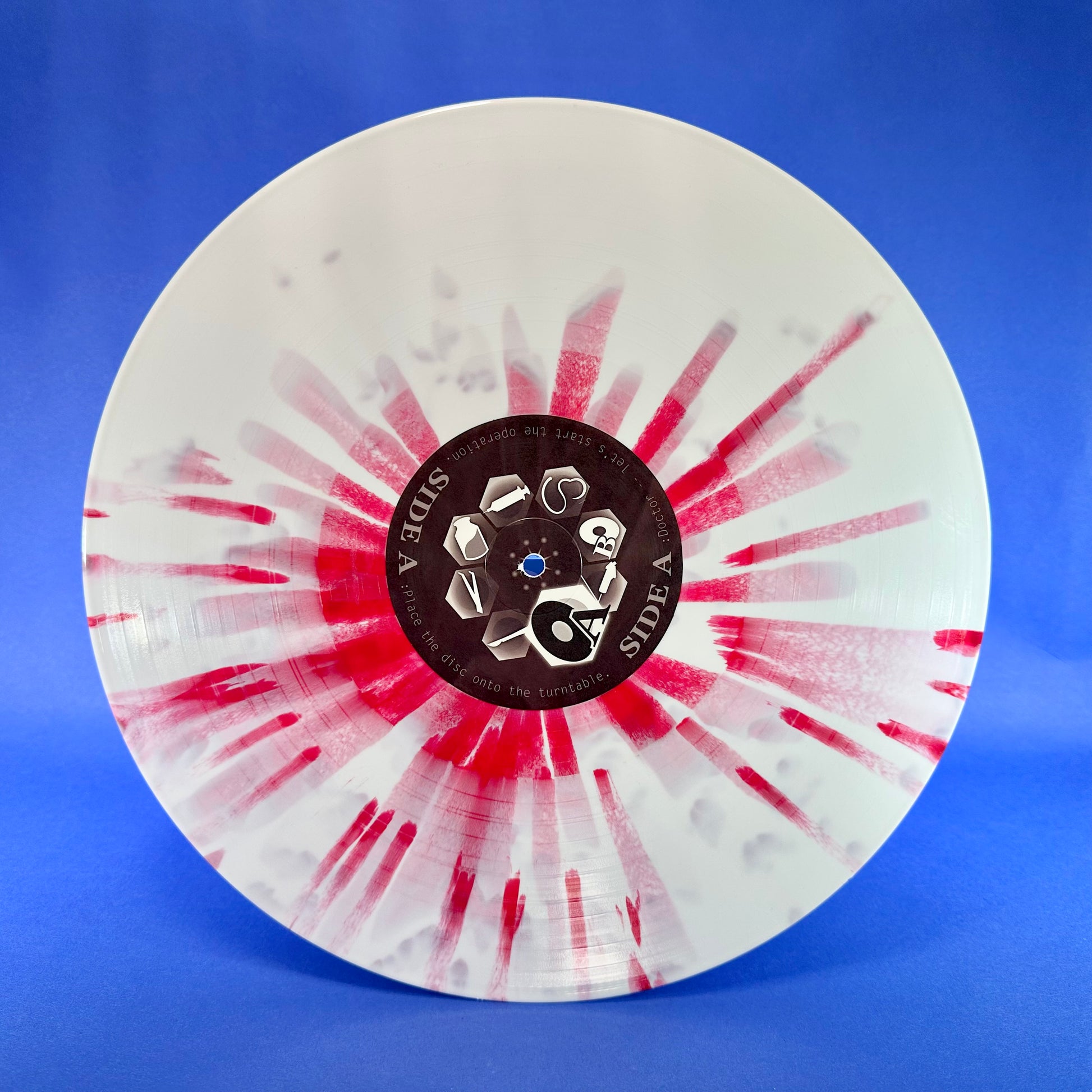 Pressed on white vinyl with red splatter. Two stickers included!