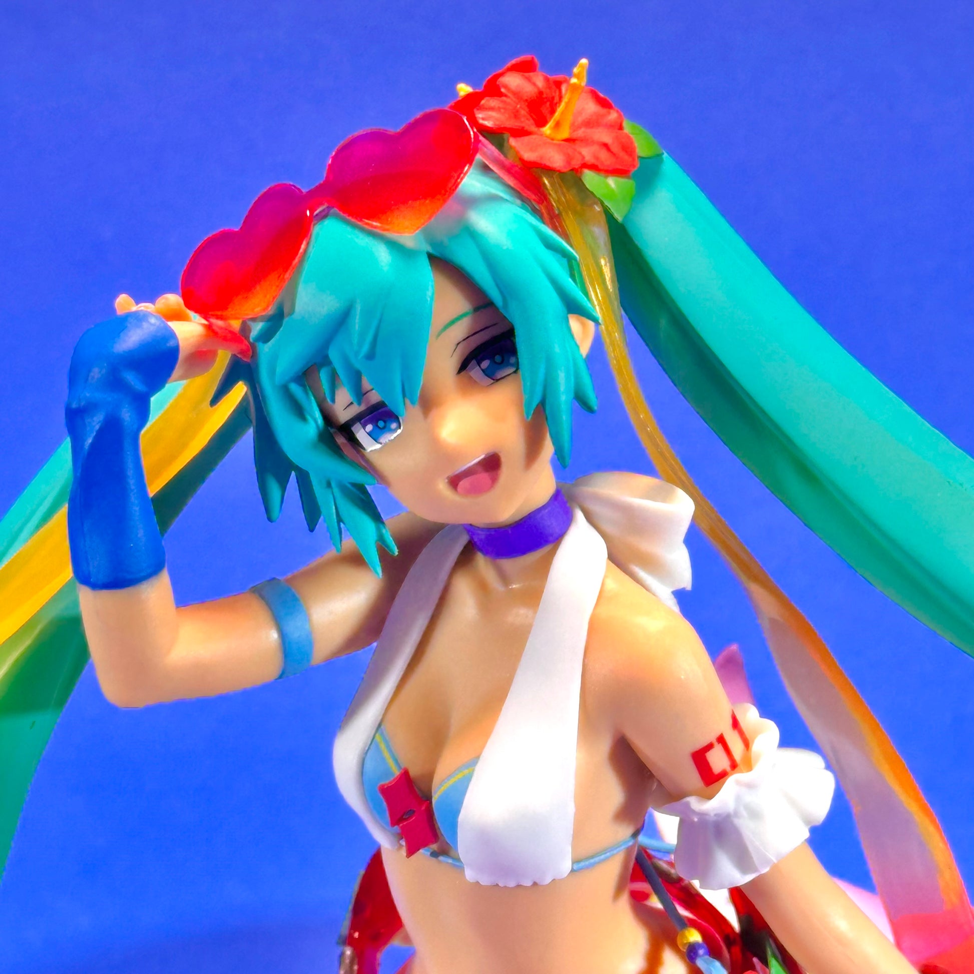From Sega comes this Super Premium Figure of Hatsune Miku (Tropical Summer Ver.). She is posed skipping along in her bathing suit and coverup as she lifts her heart frame shades and flashes a relaxed smile. Her skin is a warm bronze from being out in the sun. Hibiscus flowers decorate her hair and body while semi-translucent parts are used for the tips of her colorful, voluminous twintails and Tropical Summer fanny pack. Let her warm up your collection!