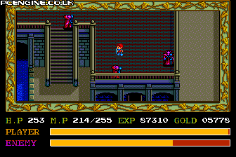 And so begins the story of Ys, with the hero Adol Christin arriving in the port town of Minea. Viewed from an overhead viewpoint, Ys follows many of the standards of role-playing games, such as killing for money and experience points, buying weapons, items and armour and so on. But the battle system is fairly unique. Instead of slashing with your sword, you bump into enemies to attack them. Positioning is important - if you bump head on, there is more chance of a parry or counter attack, whereas if you make contact from the side, or slightly offset, you stand more chance of a successful hit. As you progress, the grand story takes you to mines and temples, and crosses seamlessly over into Ys II, where magic items are introduced that allow abilities such as shooting fireballs or transforming yourself into a monster to avoid attention. All this draws to a dramatic conclusion where you must face the ultimate evil and destroy it.